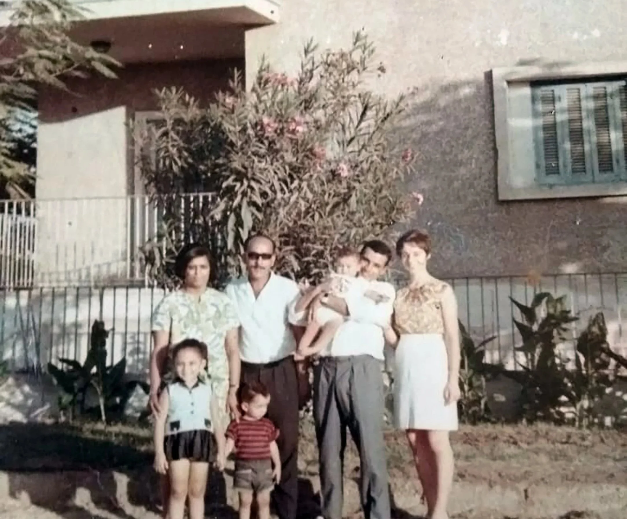 Family snapshot in front of early building in Mohandiseen, Cairo, 1960s.