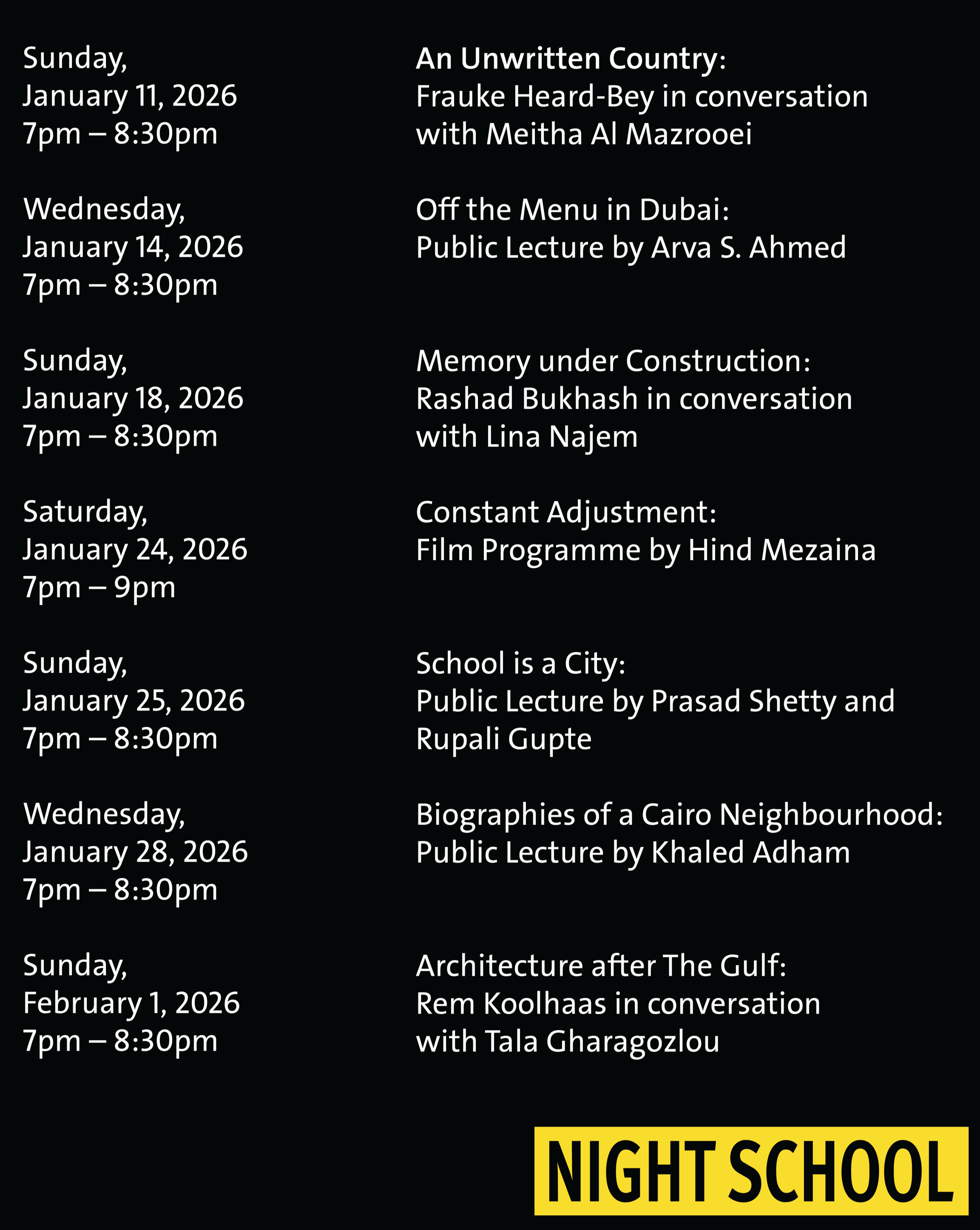 When I knocked on her door at the National Centre for Documentation and Research, I was one of many newcomers curious about the mid-2000s hype. I remember her advice because it shaped what I did next. With Frauke, it’s always the next that matters; each article or book is a step toward something larger and still in formation. At Night School, she will be in conversation with Meitha Almazrooei. I will be listening for clues about what sustains her commitment to articulating the UAE’s past. Does she constantly have to change the way she looks at UAE cities, or do they keep changing in response to her persistent examination?